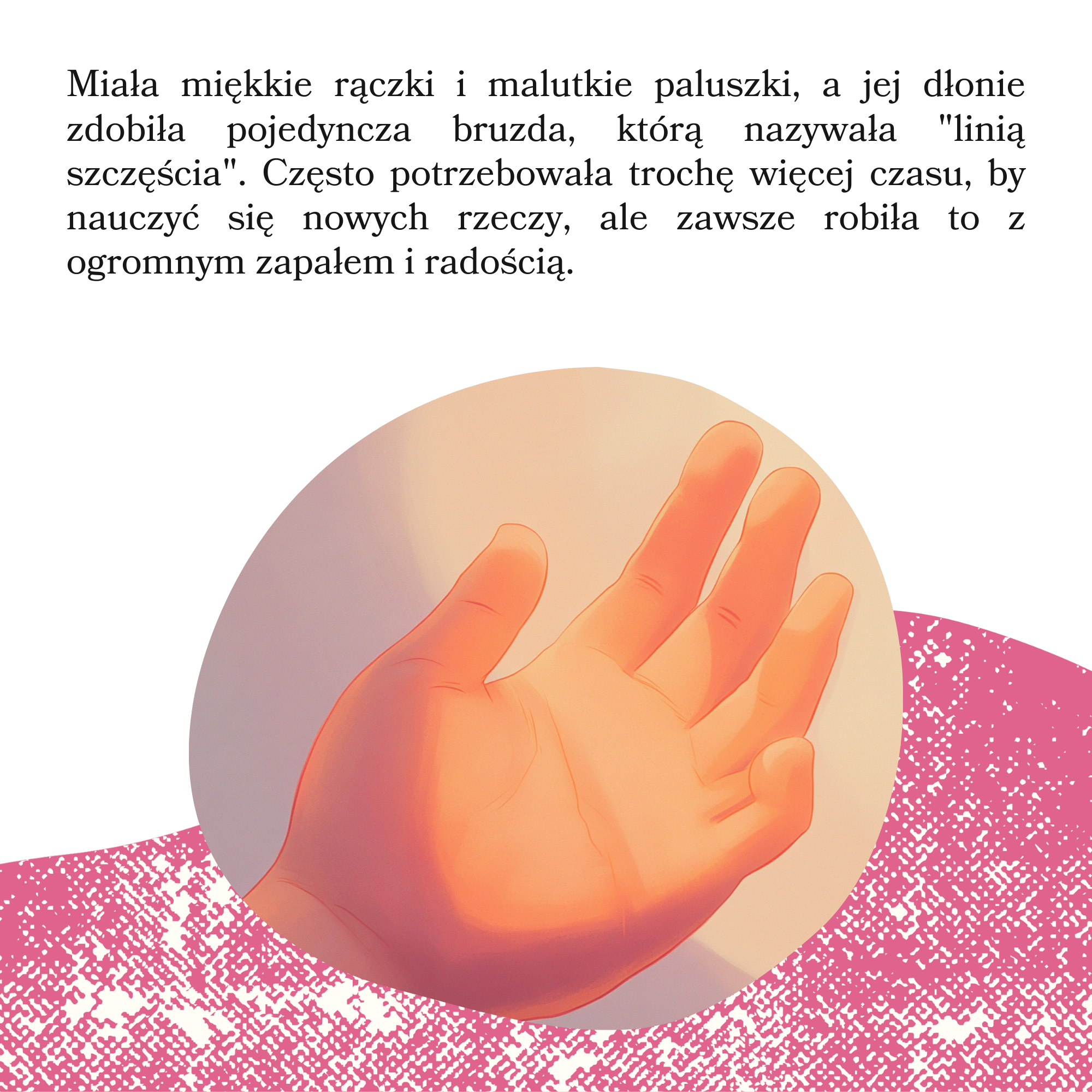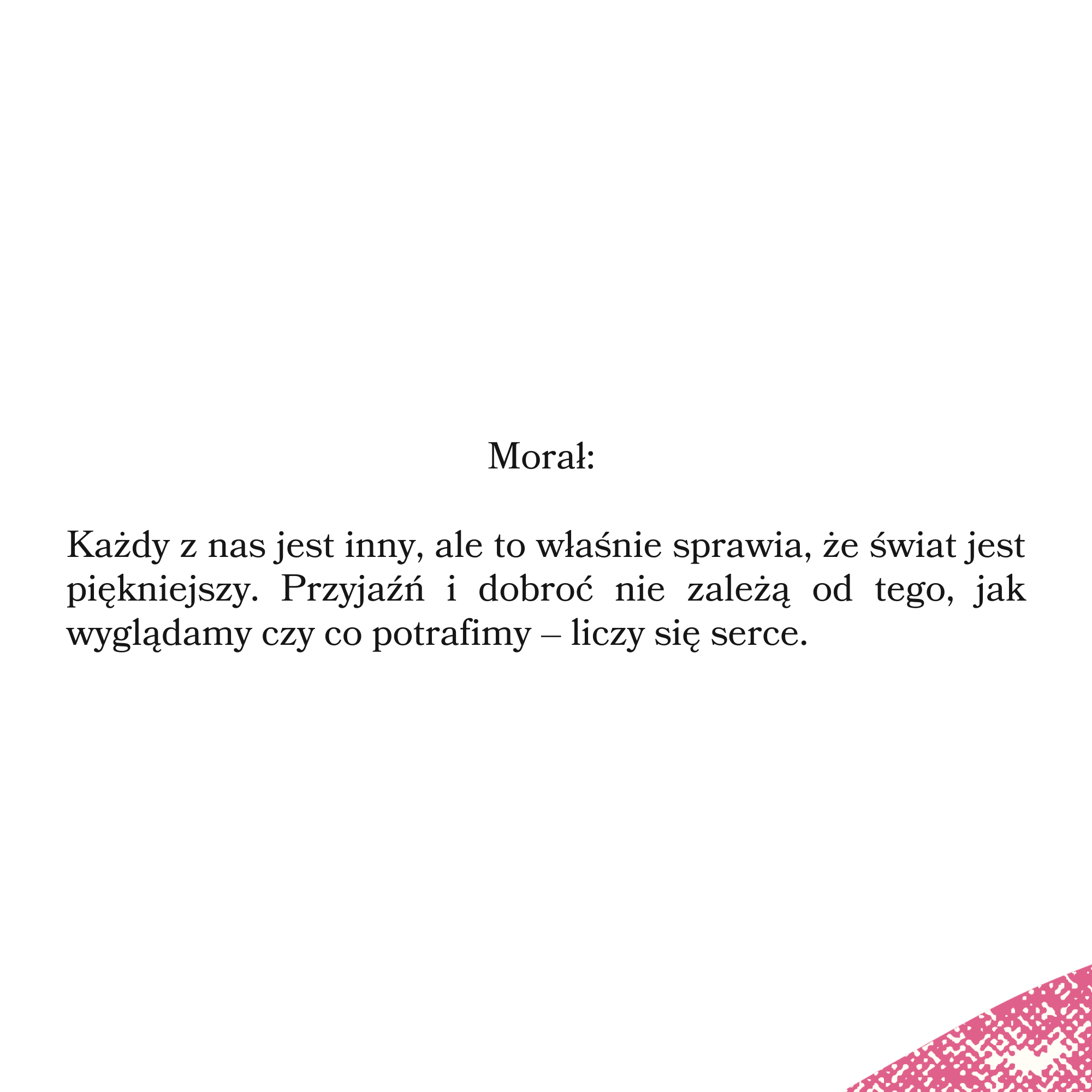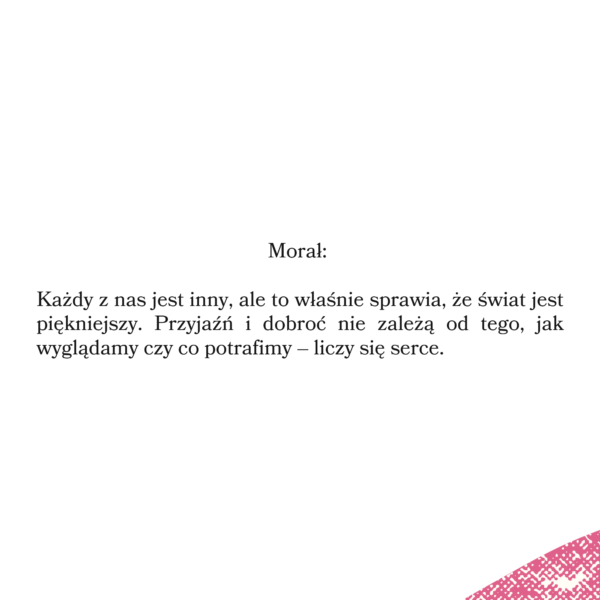 Opowiada o dziewczynce, która była inna od nich. Inna, lecz wyjątkowa. Prosty język bajki pozwala dzieciom zrozumieć, że nie wszyscy jesteśmy tacy sami-lecz piękni.