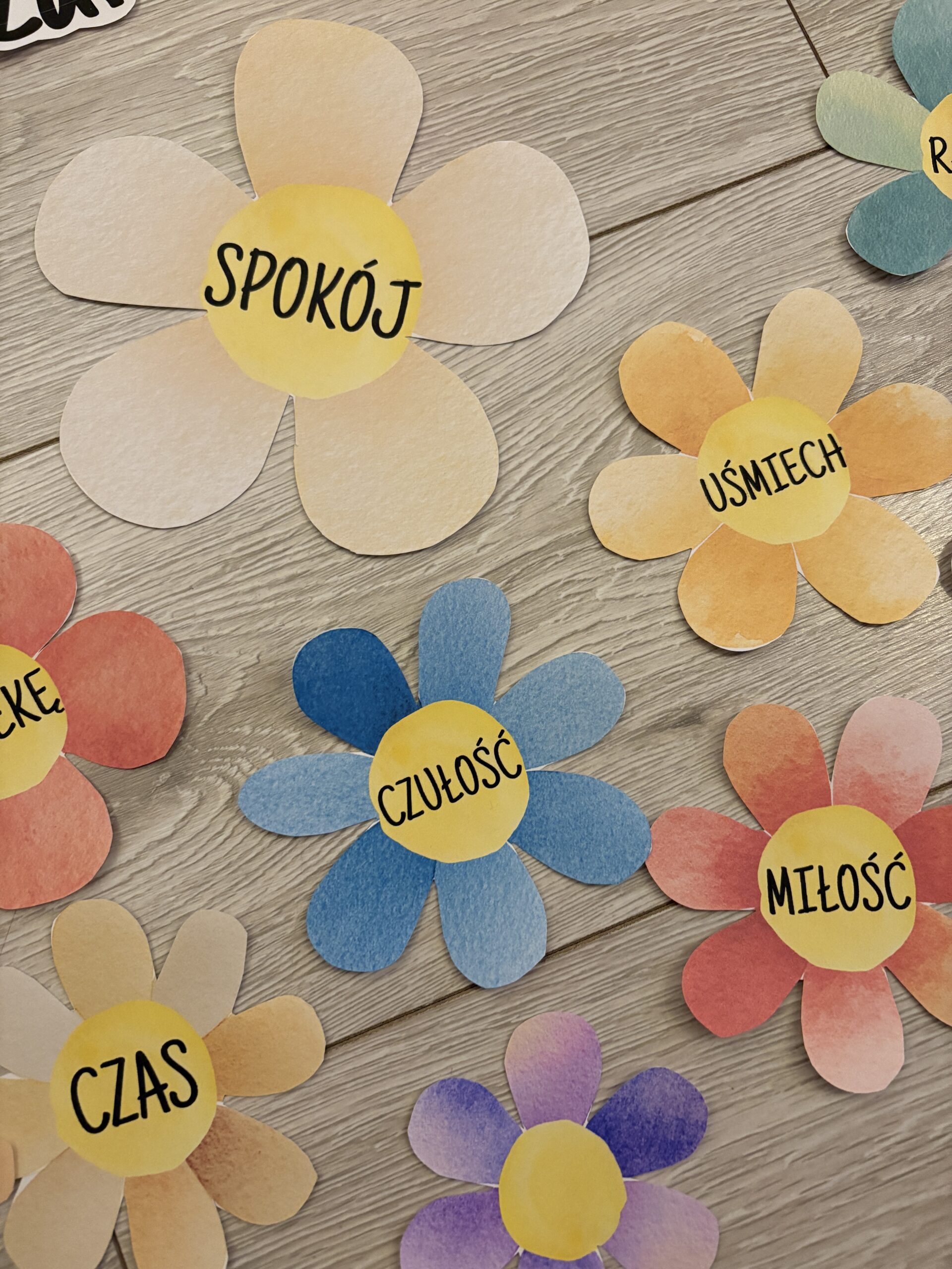 -kwiaty z wartościami, m.in.: miłość, czułość, spokój, radość, czas, obecność, ciepło, troskę, opiekę