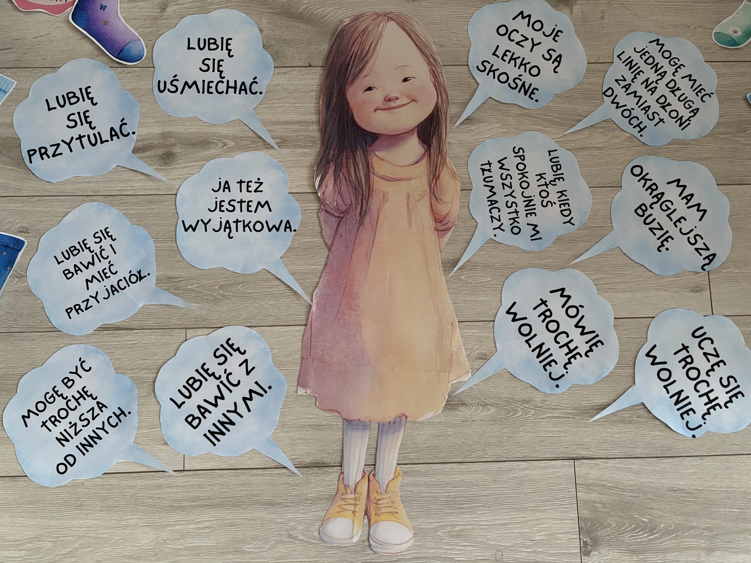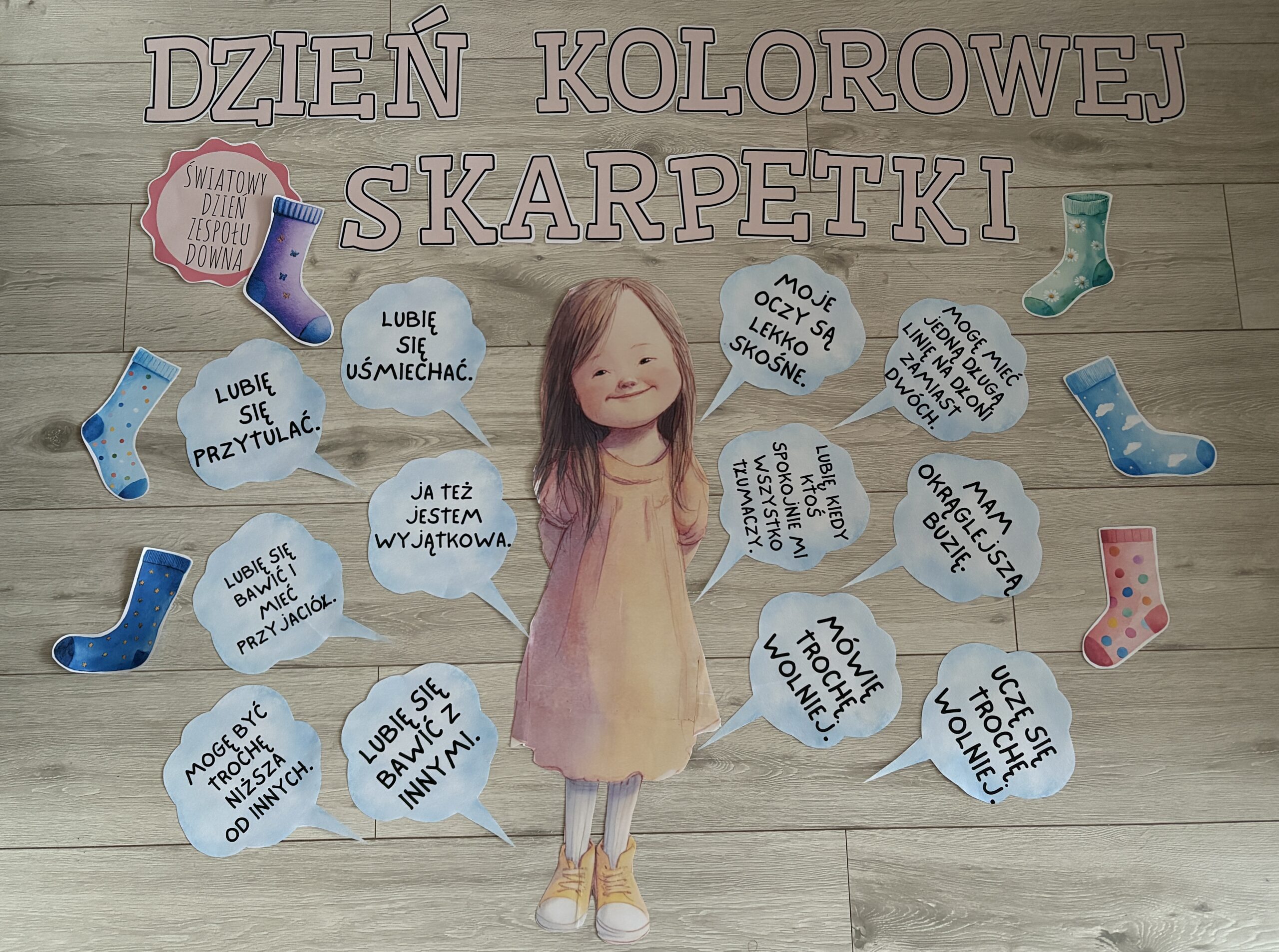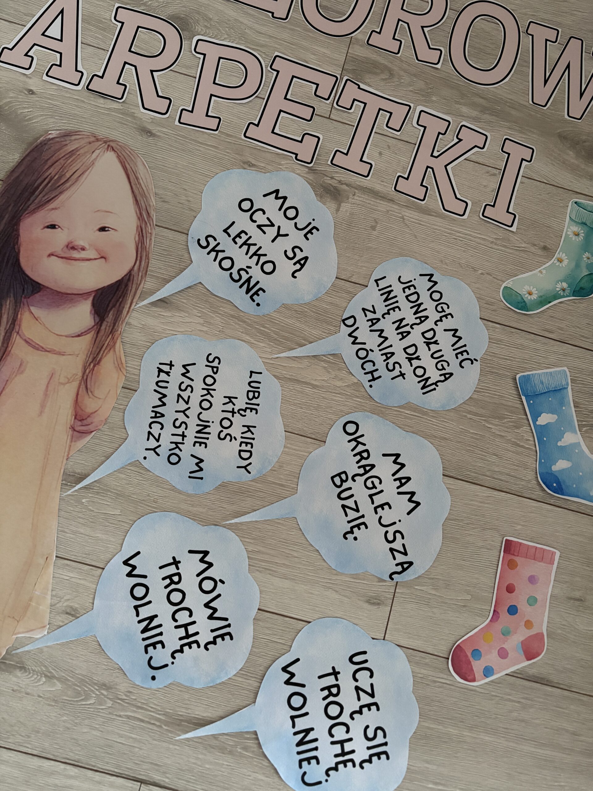 Kolorowa gazetka edukacyjna przygotowana z myślą o obchodach Światowego Dnia Zespołu Downa (21 marca). Materiał pomaga w prosty i zrozumiały sposób rozmawiać z dziećmi o różnorodności, akceptacji i wyjątkowości każdego człowieka. W centrum dekoracji znajduje się ilustracja dziewczynki z zespołem Downa, wokół której umieszczone są chmurki z krótkimi zdaniami opisującymi jej cechy i zainteresowania. Całość uzupełniają kolorowe skarpetki – symbol tego dnia, który przypomina o różnorodności ludzi i o tym, że każdy z nas jest wyjątkowy.