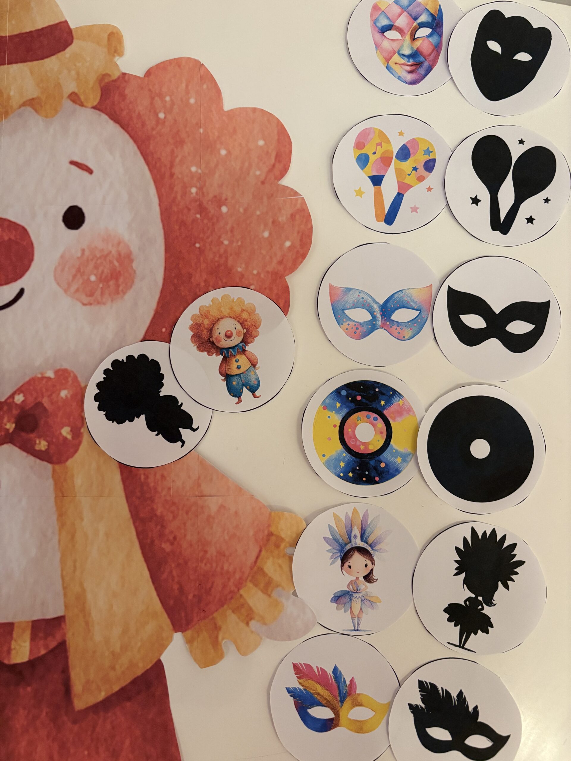 Gra „Cienie – Karnawał” to zestaw 20 okrągłych elementów, które dziecko dopasowuje parami: obrazek + jego cień.