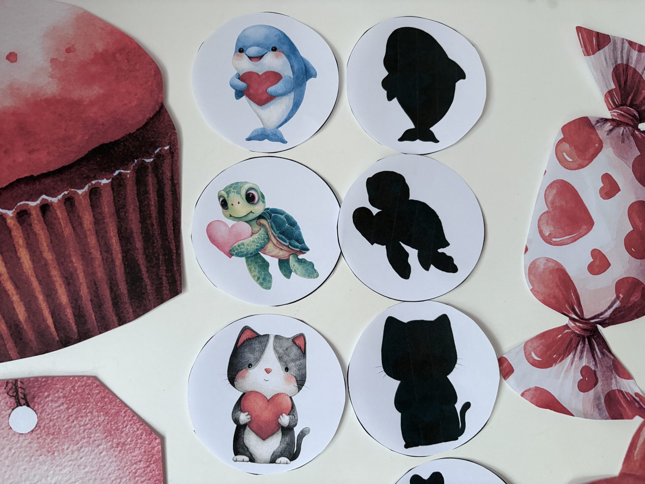 Walentynkowa gra edukacyjna „Cienie – Zwierzątka” to urocza i angażująca pomoc dydaktyczna, idealna na Walentynki oraz zajęcia rozwijające spostrzegawczość i logiczne myślenie u dzieci. Zestaw polega na dopasowywaniu kolorowych ilustracji zwierzątek do ich czarnych cieni. Ilustracje utrzymane są w ciepłym, walentynkowym klimacie – zwierzątka trzymają serduszka lub baloniki, co sprawia, że gra doskonale sprawdzi się w przedszkolu, zerówce oraz klasach 1–3.