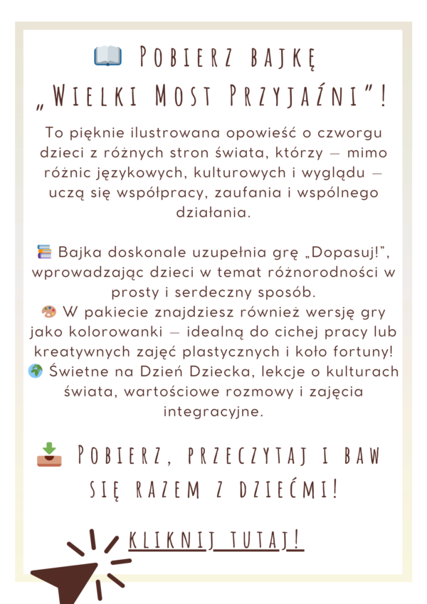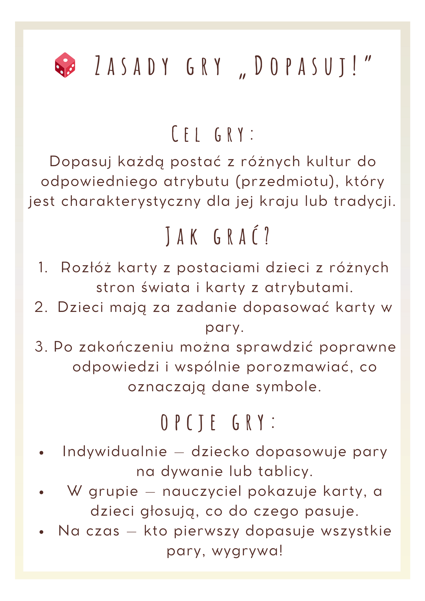 Idealne dla przedszkoli i klas 1-3. Dodatkowo gra „Dopasuj” w wersji kolorowej– łączenie dzieci z ich kulturą i symbolami.