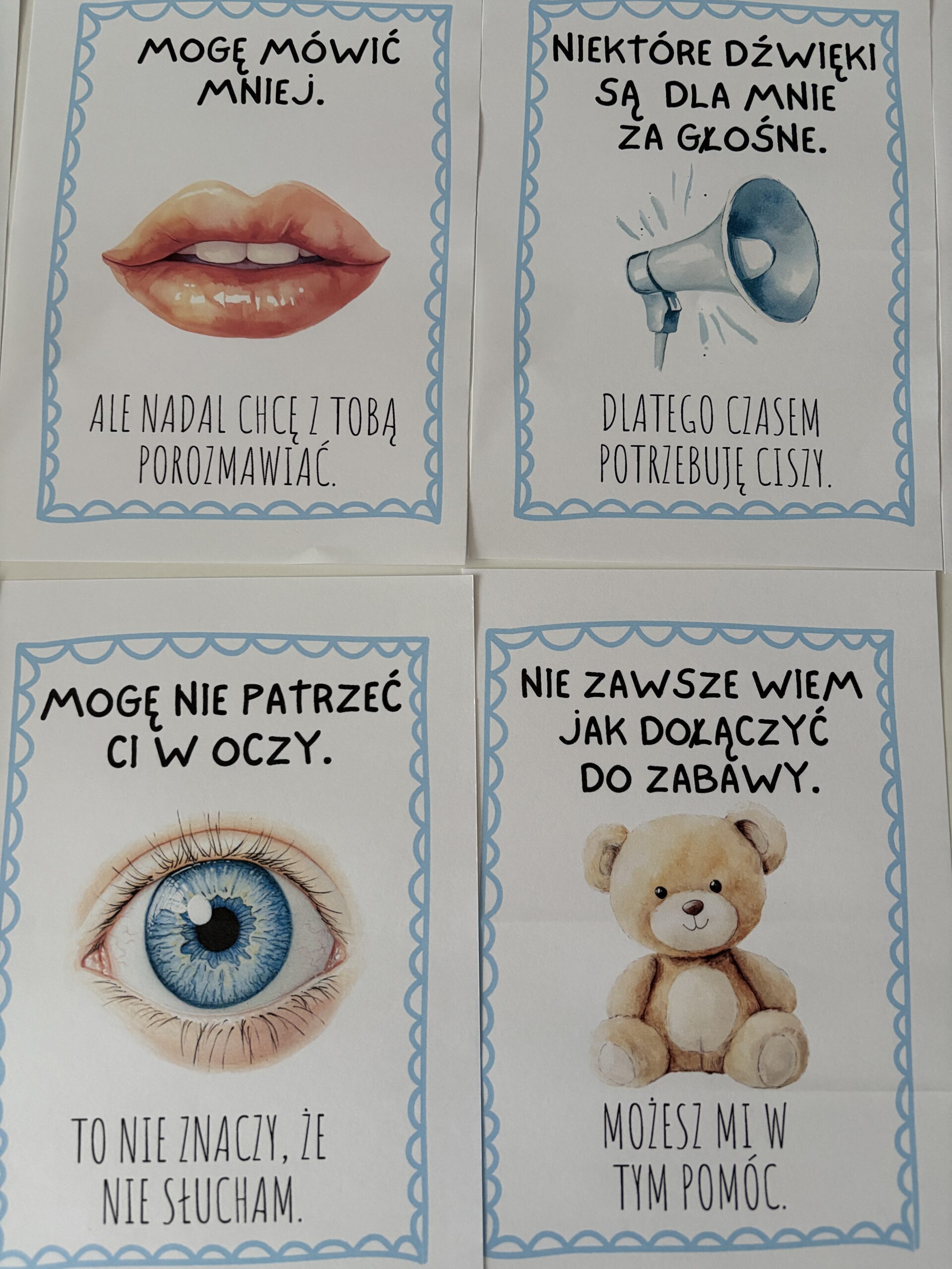 Plansze edukacyjne „Osoba w spektrum autyzmu” (11 kart) to zestaw, który pomaga dzieciom zrozumieć, jak funkcjonują osoby w spektrum — w prosty, obrazowy i wspierający sposób. Każda plansza pokazuje konkretną sytuację lub trudność oraz tłumaczy ją językiem dziecka. To gotowe narzędzie do pracy w klasie, które wspiera budowanie empatii i akceptacji.